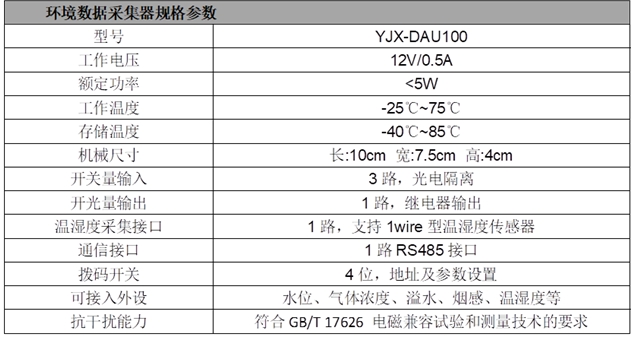 采集配电室的各项环境参数,包括电缆夹层水位、温湿度、配电室温湿度、烟感信息,并可对水泵、风机进行启停控制,及时处理险情。 数据上传接口采用标准modbus-RTU通信协议。