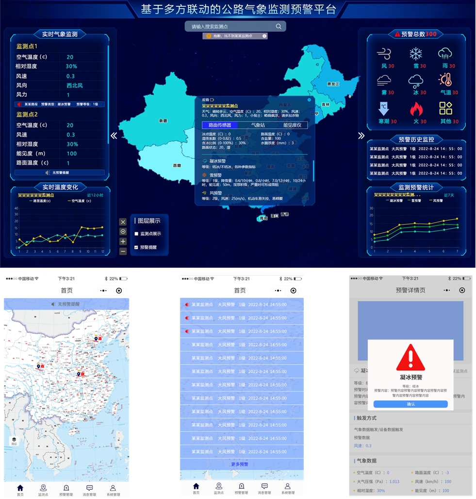 该预警平台基于GIS地理信息和气象大数据建立,以气象站数据、路面状况数据、设备状态信息采集为基础,以气象部门大数据为依托,向公路管理者提供分钟级、 公里级临近气象预报、全面灾害信息预警、趋势预报,通过可量化的精确数据为交通管制提供决策依据,以实现公路气象的全面监测和动态管理,提前布置处置策略, 降低公路的事故率,提高公路的利用效率和经济效益。